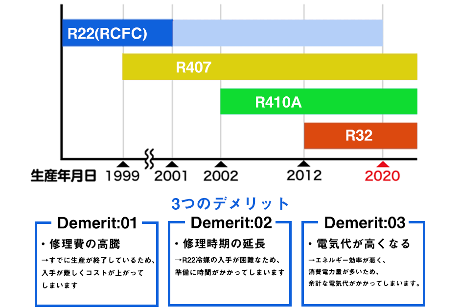 以前まで主流だったR22冷媒搭載のエアコンは、2020年を目途に完全撤廃となりました。そのため、もしもR22冷媒が搭載されたエアコンが故障してしまった場合は修理費用が高まる可能性や、部品を入手するために修理完了までの時間が掛かってしまうリスクがあります。